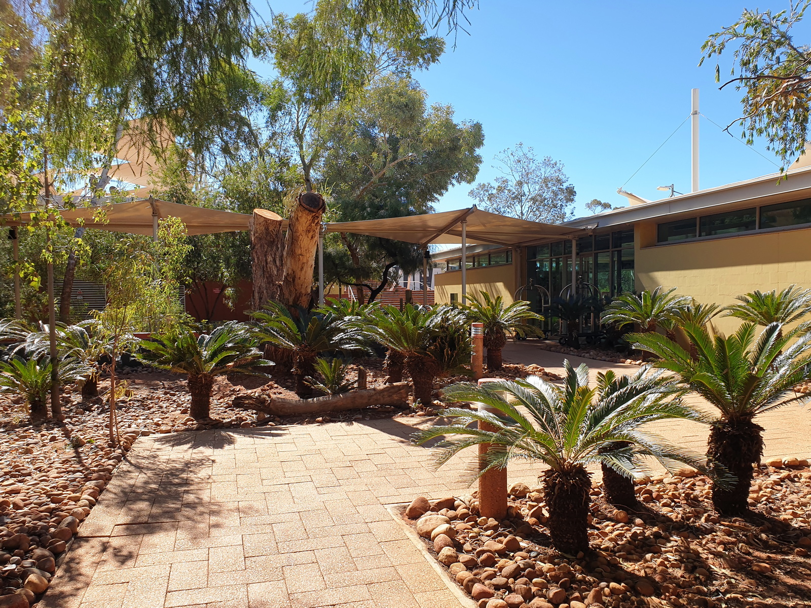 Das Ayers Rock Resort➚ befinden sich im kleinen Touristenort Yulara und bietet die einzigen Übernachtungsmöglichkeit im Uluru Nationalpark. Hier gibt es einige Hotels in verschiedenen Kategorien und ein Campingplatz zur Auswahl. Neben den Hotelrestaurants gibt es auf dem zentralen Platz des Touristenortes einige wenige Restaurants, einen Supermarkt, Souvenirshops, Tankstelle und Tourenanbieter. Einen Take-Away gibt es nur in der The Outback Lodge des Ayes Rock Resorts, die etwas auserhalb des Touristenortes Yulara liegt. Alkohol darf nur von Gästen des Ayers Rock Resorts gekauft und konsumiert werden, dh. man muß Lichtbildausweis und einen Zimmerschlüssel oder Campingplatzpass vorlegen und es gibt tägliche Beschränkungen auf paar Bier oder eine Flasche Wein.