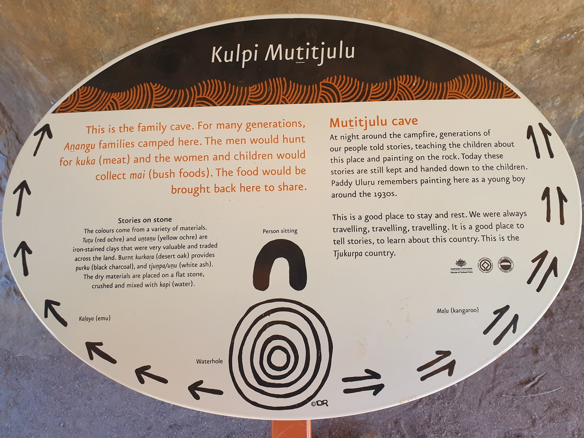 Uluru ist ein wichtiger spiritueller Ort, heilig für die Anagu-Ureinwohner. Es befinden sich in den Wänden viele Höhlen, die verschiedenen Zwecken dienten und die mit uralter Felsmalereien bemalt sind. Man kann den Monolithen ganz umrunden (ca. 10km) auf dem Uluru Base Walks oder nur kürzere Wanderungen machen. Wir machten den Uluru Mala Walk und den Kuniya Walk zum Muṯitjulu Waterhole.