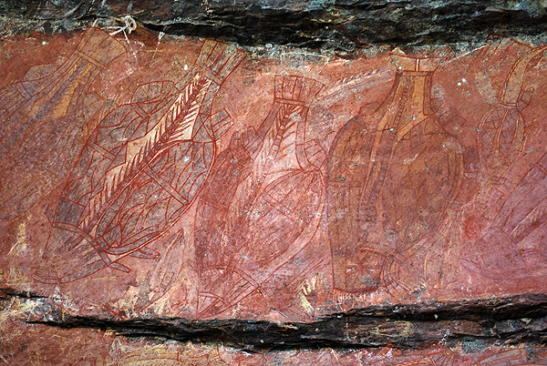 Ubirr ist etwa 40km von Jabiru entfernt in der East Aligator Region des Kakadu National Parks und ist bekannt für seine Aborigine Malereien auf einer Gruppe von Felsen am Rande der Nadab Aue. Einige sind viele Tausende von Jahren alt, wie eine Zeichnung eines Thylacine. Diese Tiere sind inzwischen ausgestorben. Die letzten dieser Art gab es in Tasmanien deswegen werden sie auch Tasmanian Tiger oder Tasmanian Wolf genannt. Die anderen Malereien stellen vor allem Fische aus der Umgebung dar. Viele der Ranger, die für Besonders Interessierte an verschiedenen Stellen Vorträge (Ranger Talks) halten, sind Eingeborene.