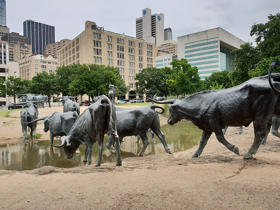 Von Reunion Tower ging es zunächst Richtung Pioneer Plaza. Hier haben wir uns den Dallas Cattle Drive, eine Ansammlung beeindruckender Bronzeskulpturen, die eine Herde lebensgroßer Longhorn-Rinder die von Cowboys angetrieben werden, darstellt. Die Pioneer Plaza mit dem benachbarten alter Friedhof war sehr nett zum Schlendern.